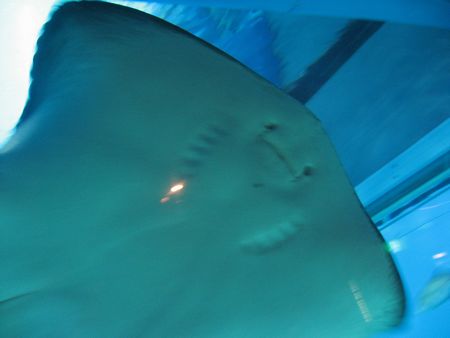 息子はじ~っと見ていましたが、それよりも水槽の下やら横から現れる大きなエイを見て喜んでいました。